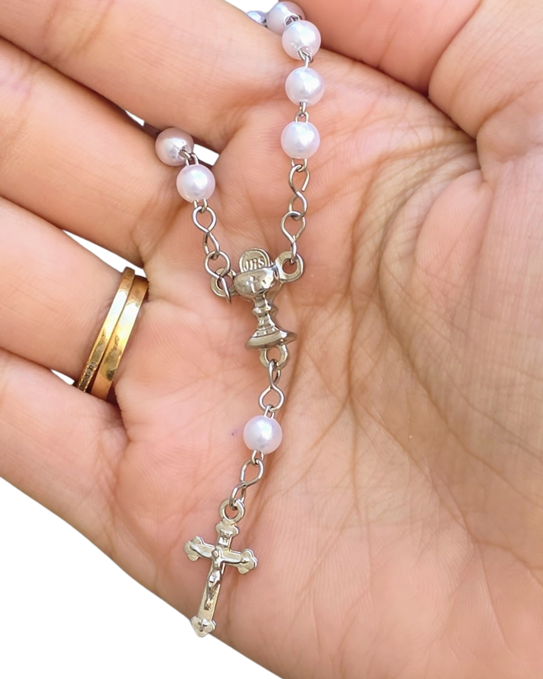 Material: Contas de pérola com entremeio em forma de Cálice Eucarístico.
