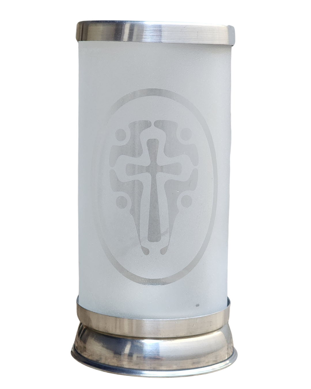 Produzido em vidro transparente jateado fosco, este porta-vela recebe a imagem da Cruz do Catequista, criando um efeito de luz delicado e simbólico quando a vela é acesa. O resultado é uma peça exclusiva e personalizada, pensada especialmente para quem vive e anuncia a fé no dia a dia da catequese.