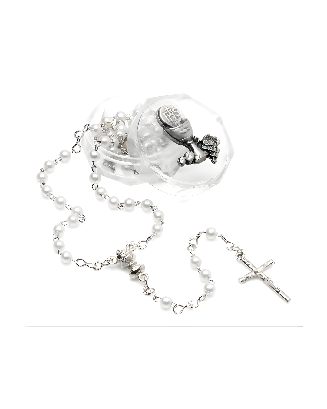 Este delicado terço, com contas em pérola branca, foi pensado especialmente para esse momento tão especial. Mais do que uma lembrança, ele se torna um instrumento de oração, ajudando a criança a dar seus primeiros passos na intimidade com Deus e fortalecendo sua fé desde cedo.